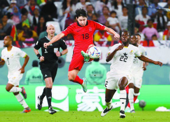 28일 오후(현지시간) 카타르 알라이얀의 에듀케이션 시티 스타디움에서 열린 2022카타르 월드컵 조별리그 H조 2차전 대한민국과 가나의 경기. 이강인이 공을 따내고 있다. 연합뉴스 |