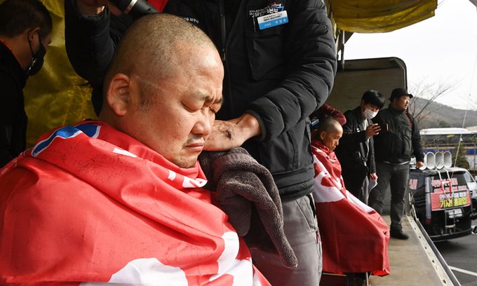 투쟁일변도 29일 경기 의왕시 내륙컨테이너기지(ICD)에서 열린 결의대회에서 간부들이 업무개시명령 발동에 반발하며 삭발하고 있다. 의왕=허정호 선임기자