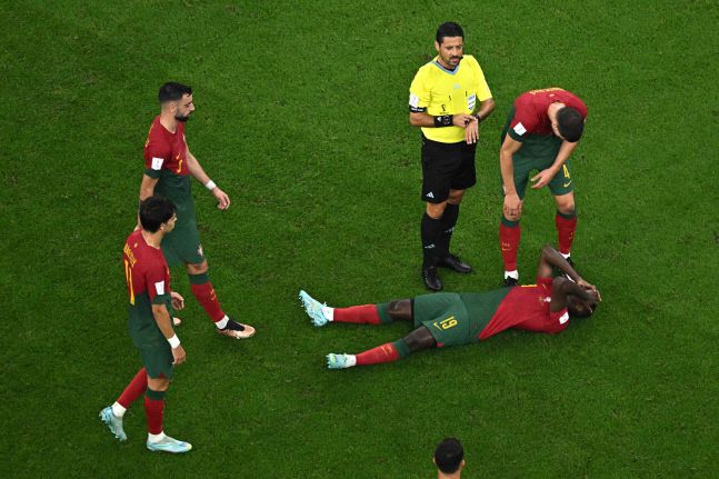 누누 멘데스(가운데)가 우루과이전에서 부상으로 고통스러워하며 그라운드에 누워 있다. 도하 | AFP연합뉴스 |