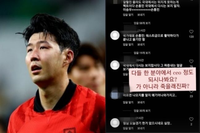 네티즌들은 "형님 오늘 경기에서 한 거 없으시네요. 실망", "아프면 나오지를 말지 왜 기어나와가지고", "국대에서 다시는 보지 맙시다", "국가대표 손흥민은 워스트급으로 활약하다가 끝나고 울기만 함" 등 거친 말들을 쏟아냈다.