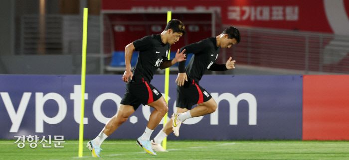 한국 축구대표팀 공격수 황희찬(왼쪽)과 수비수 조유민이 29일 카타르 도하의 알 에글라 훈련장에서 훈련하고 있다. 도하 | 권도현 기자 |