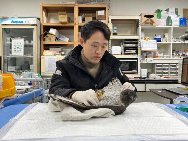김봉균 충남야생동물구조센터 재활관리사가 부상당한 참매를 살펴보고 있다. 충남야생동물구조센터 제공