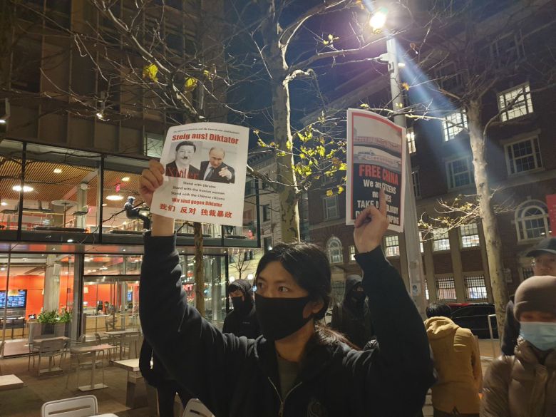 중국인 유학생들은 시진핑 중국 국가주석의 얼굴에 히틀러 콧수염을 합성한 풍자 피켓을 들고 “시진핑과 중국공산당(CCP)은 물러가라”는 구호를 외쳤다. 이들은 “왜 중국인들은 이 자리에 모였나”라고 쓴 팸플릿을 나눠줬다.