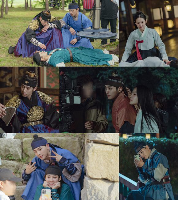 특히 왕으로 완벽 분한 김영대가 촬영 중간중간 대본에 집중하는 모습도 인상적이다. 또한 계단에 나란히 앉은 박주현과 김우석은 상큼한 포즈로 사진을 찍고 있고 뭔가를 바라보며 미소를 짓는 김우석의 모습에서 유쾌한 현장 분위기가 느껴진다.