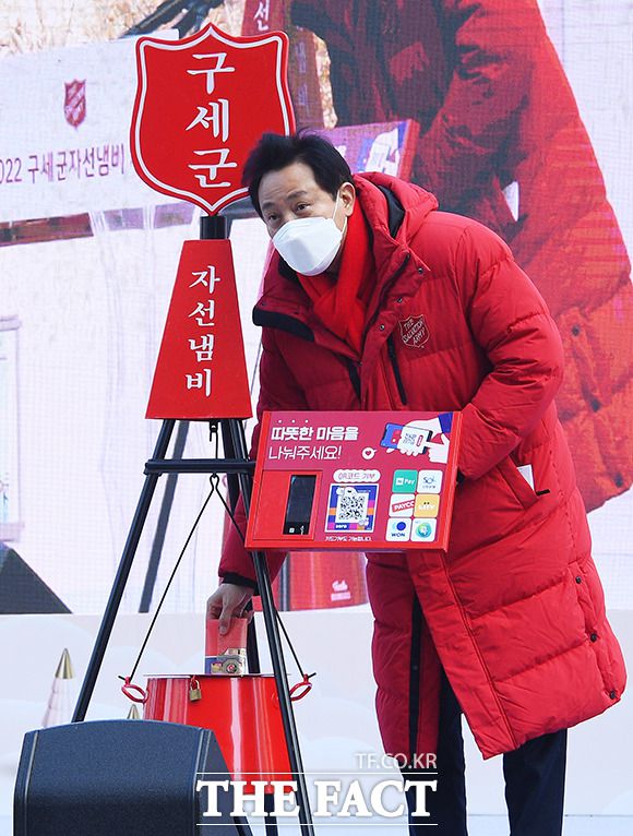 [더팩트ㅣ이동률 기자] 오세훈 서울시장이 1일 오전 서울 중구 서울광장에서 열린 '2022 구세군 자선냄비 시종식'에 참석해 성금을 전달하고 있다.