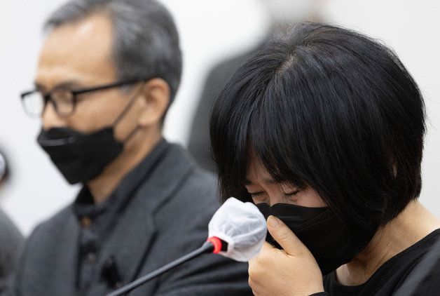 이태원 참사 희생자 유가족이 1일 오후 서울 여의도 국회에서 열린 용산 이태원 참사 진상규명과 재발방지를 위한 국정조사 특별위원회 유가족 간담회에서 눈물을 흘리고 있다. 2022.12.1/뉴스1
