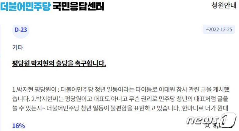 더불어민주당 청원 게시판인 '국민응답센터'에는 지난달 25일부터 이 모씨의 '평당원 박지현의 출당을 촉구합니다'라는 청원이 올라와 있다.