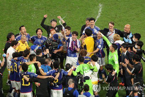 조1위로 16강 진출한 일본(알라이얀=연합뉴스) 김주성 기자 = 1일 오후(현지시간) 카타르 알라이얀의 칼리파 인터내셔널 스타디움에서 열린 2022 카타르 월드컵 조별리그 E조 3차전 일본 대 스페인 경기.      스페인을 누르고 조 1위로 16강에 진출한 일본 선수들이 환호하고 있다. 2022.12.2 utzza@yna.co.kr