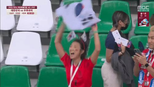 한국과 우루과이의 경기에서 한 여성 관중이 열띤 응원을 펼치고 있다. 사진=MBC방송화면 캡처 |