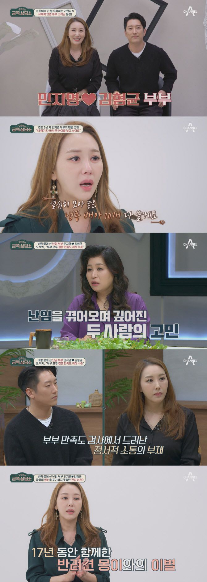 2일 방송 예정인 채널A ‘오은영의 금쪽상담소’에서는 결혼 5년 차, 배우 민지영과 쇼호스트 김형균 부부가 상담소 문을 두드린다. ‘장기 하나를 다 바쳐서라도 아이를 낳아야 한다’는 아내 민지영과 ‘무리하게 시험관 시술을 하는 아내를 말리고 싶다’는 남편 김형균. 두 사람의 절절한 고민 고백에 수제자 정형돈은 상담이 시작되기 전부터 눈시울을 붉혔다는 전언이다.