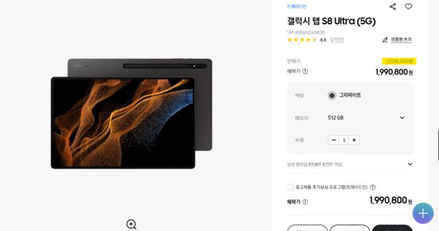 삼성전자가 지난 1일 갤럭시탭 제품군 가격을 기습인상했다. 이에 따라 최상위 모델 '갤럭시탭S8 5G 512GB' 모델의 정가는 212만8500원으로 올랐다. 삼성전자의 태블릿 제품이 200만 원을 넘기는 것은 이번이 처음이다. /삼성닷컴 캡쳐 |