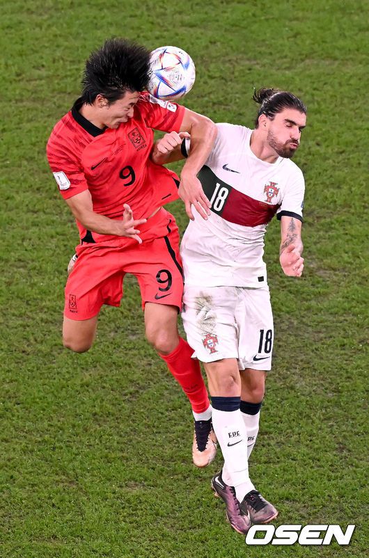 [OSEN=알 라이얀(카타르), 박준형 기자] 2일 (현지시간) 카타르 도하 에듀케이션 시티 스타디움에서 2022 카타르월드컵 H조 최종전 대한민국과 포르투갈의 경기가 진행됐다.현재 대한민국은 1무1패(승점1)로16강 진출을 위해서는 이미 2승으로 조별리그 통과를 확정한 포르투갈을 반드시 꺾고 ‘경우의 수’에 희망을 걸어야 하는 상황이다.전반 한국 조규성이 포르투갈 네베스와 공중볼 다툼을 벌이고 있다. 2022.12.02 /soul1014@osen.co.kr
