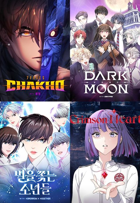 하이브는 올해 1월 BTS ‘7FATES: CHAKHO’를 시작으로 엔하이픈, 투모로우바이투게더, 르세라핌 등 자사 아티스트 지식재산권(IP)을 활용한 4개의 웹툰(오리지널 스토리)을 내놨다. 당장 오는 6일에도 자사 최초 일본 남자아이돌 ‘앤팀(&TEAM)’을 소재로 한 ‘DARK MOON: 회색 도시’도 신규 공개할 예정이다.