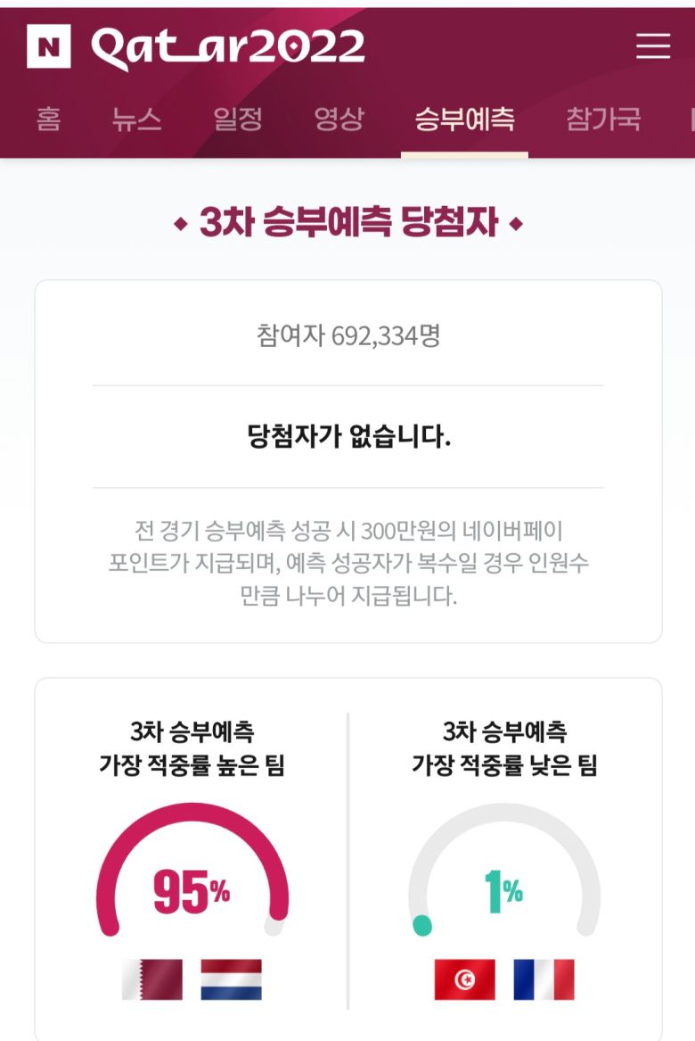 3일 네이버에 따르면 '2022 카타르 월드컵' 조별예선 3차전 승부예측 참여자 69만2325명을 기록했다. 이 가운데 전 경기 예측에 성공한 참여자는 0명이었다.