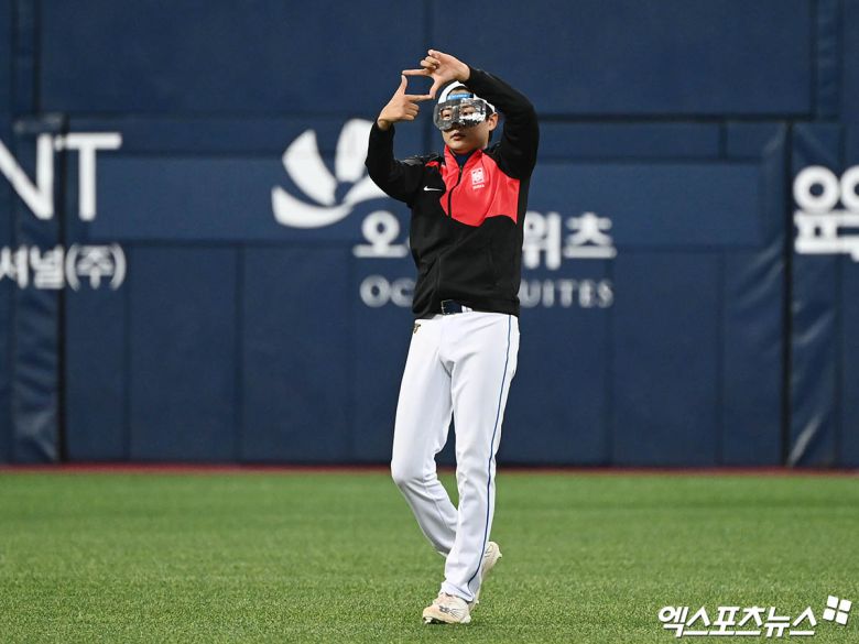 (엑스포츠뉴스 고척, 박지영 기자) 3일 오후 서울 구로구 고척스카이돔에서 열린 '2022 희망더하기 자선야구대회' 양신팀과 종범신팀의 경기, 4회초 양신팀 중견수 정철원이 세리머니를 하고 있다.