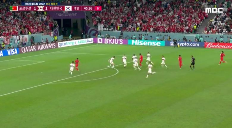 이 과정에서 포르투갈 선수 8명이 동시에 내려왔다. 1명은 반대쪽의 황희찬을 막기 위해 빠져나갔지만, 나머지 7명은 손흥민 쪽으로 달려가 그를 에워쌌다. 손흥민을 막기 위해서였다.