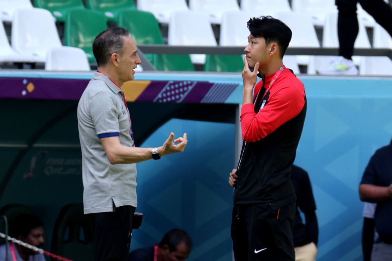 파울루 밴투 대한민국 축구대표팀 감독과 손흥민이 지난달 21일(현지시각) 조별리그가 열리는 카타르 알라이얀의 에듀케이션 시티 스타디움을 찾아 대화하고 있다. /뉴스1 |