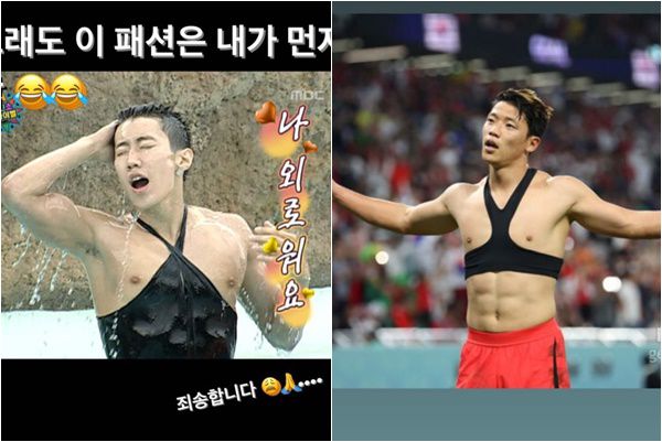 그러면서도 “그래도 이 패션은 내가 먼저 함”이라며 과거 MBC ‘무한도전’에 출연한 자신의 모습을 공개하기도 했는데, 상의 탈의 세레머니를 한 황희찬과 비슷한 차림으로 웃음을 안겼다.