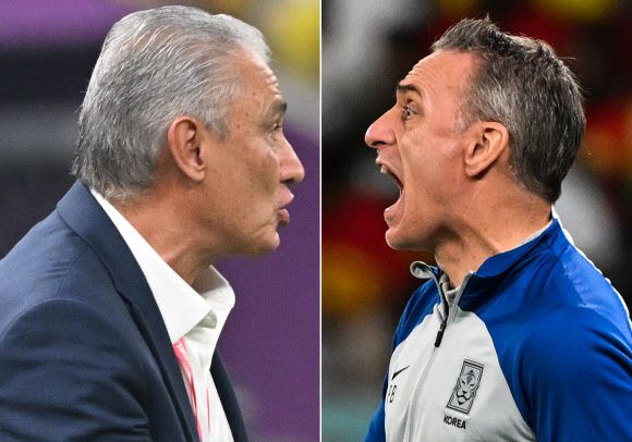 6일 오전 4시(한국시간) 2022년 카타르월드컵 16강전에서 맞붙는 브라질의 치치(왼쪽) 감독과 한국 대표팀의 파울루 벤투 감독. 치치 감독이 G조 카메룬과의 3차전을 지휘하는 모습과 벤투 감독이 가나와의 H조 2차전 뭔가를 지시하는 모습.AFP 자료사진 연합뉴스 |