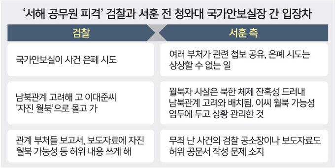 서 전 실장은 또 이씨가 자진 월북한 것으로 몰아가도록 해양경찰청 등 관계 부처들이 보고서나 보도자료에 허위 내용을 쓰게 했다는 혐의(허위 공문서 작성 및 행사)도 받는다. 검찰은 2019년 하노이 북·미 정상회담 결렬 등으로 당시 악화일로를 걸었던 남북관계를 고려해 컨트롤타워인 국가안보실이 월북 몰이를 주도했다고 보고 있다. 검찰은 이씨가 실족해 북한 해역에서 표류했을 가능성에 무게를 두는 것으로 알려졌다.