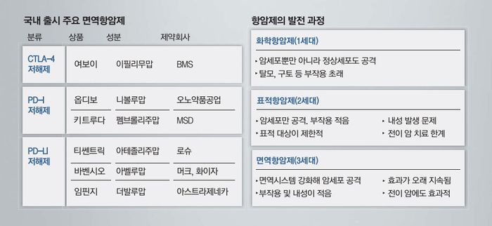 관문 작용을 막는 면역관문 억제제는 면역항암제의 대표적인 형태로 자리 잡았다. 현재 국내에는 CTLA-4 저해제인 BMS의 여보이(성분명 이필리무맙), PD-1 저해제인 오노약품공업의 옵디보(성분명 니볼루맙)와 MSD의 키트루다, PD-L1 저해제인 로슈의 티쎈트릭(성분명 아테졸리주맙), 머크-화이자의 바벤시오(성분명 아벨루맙), 아스트라제네카의 임핀지(성분명 더발루맙) 등이 출시됐다.