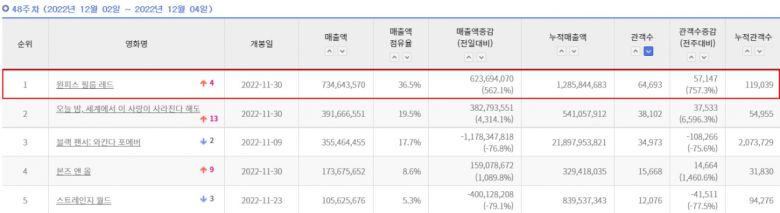 '원피스 필름 레드', 개봉 첫 주말 외화 박스오피스 1위··· 글로벌 신드롬 돌풍 주말 극장가 사로잡다!