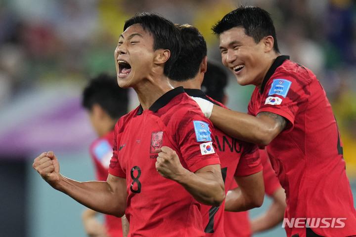 [도하=뉴시스/AP] 백승호(왼쪽)가 브라질과 16강전에서 중거리 슛을 성공 시킨 후 포효하고 있다. 2022.12.05