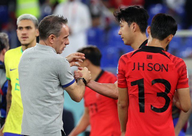 5일(현지시간) 카타르 도하 스타디움 974에서 열린 2022 카타르 월드컵 16강전 브라질과 대한민국의 경기, 한국 벤투 감독이 브라질에 1-4로 패한 뒤 손흥민을 위로하고 있다. 도하(카타르)=뉴시스 |