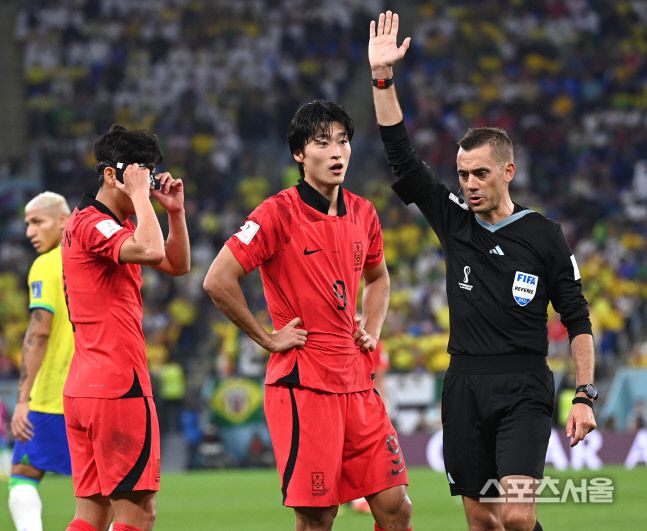 조규성이 5일(한국시간 6일) 카타르 도하 스타디움 974에서 열린 2022 카타르 월드컵 16강전 브라질과 경기에서 심판판정에 항의하고 있다. 2022. 12. 5.도하(카타르) | 최승섭기자 thunder@sportsseoul.com