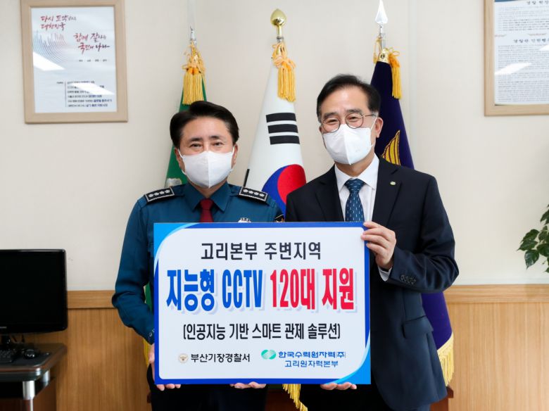 한국수력원자력 고리원자력본부는 5일 기장경찰서에서‘고리본부 주변지역 지능형 CCTV 설치 지원사업’협약식을 갖고, 주변지역인 장안읍 일대에 총120대 설치를 지원하기로 하였다. 이광훈 고리원자력본부장(사진 오른쪽)과 황철환 기장경찰서장이 기념촬영을 하고 있다. [한수원 제공]