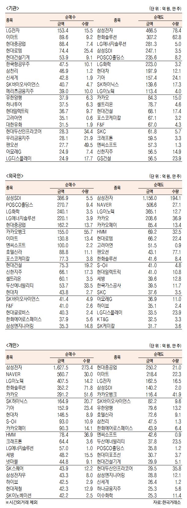 ◇기관·외국인 순매수 주요 종목=LG전자(066570) 삼성SDI(006400) 이마트(139480) POSCO홀딩스(005490) 현대중공업(329180) LG화학(051910) 현대로템(064350) LG에너지솔루션(373220) 현대건설기계(267270) 한국항공우주(047810) 카카오뱅크(323410) 삼천리(004690) 신세계(004170) 엔씨소프트(036570) SK바이오사이언스(302440) 호텔신라(008770)