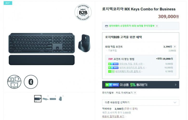 결국 기자가 구매한 제품은 더 비싼 비즈니스용 키보드·마우스 콤보인 'MX Keys COMBO for Business(이하 비즈니스 콤보)'다. 이 제품은 'MX Keys(로지볼트 적용)' 키보드와 MX Master 3S의 이전 버전인 'MX Master 3' 마우스가 '로지 볼트' 수신기 한 개에 동시에 페어링되어 출고되는 제품이며 팜레스트가 포함되어 가격은 309,000원이다.