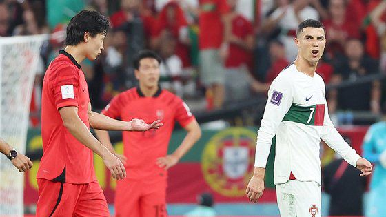 3일 오전(한국시간) 카타르 알라이얀의 에듀케이션 시티 스타디움에서 열린 2022 카타르 월드컵 조별리그 H조 3차전 대한민국과 포르투갈 경기. 교체아웃되던 포르투갈 크리스티아누 호날두가 대표팀 조규성과 언쟁을 벌이고 있다.연합뉴스 |