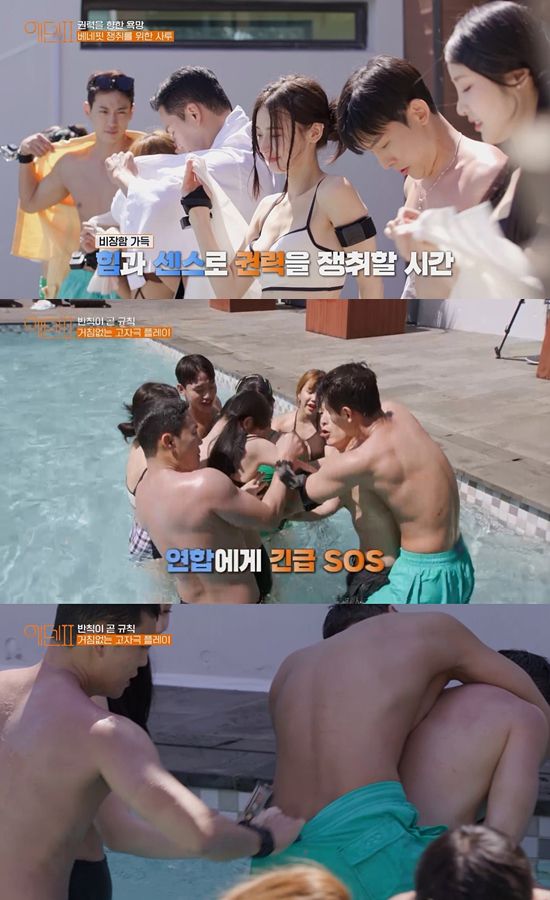 에덴 카드의 윤곽이 드러나자 몸싸움은 더 거칠어졌다. 먼저 에덴 카드를 갖고 있는 조이건 현채희 커플이 타깃이 됐다. 한 여성 출연자가 현채희의 엉덩이를 더듬었고, 다른 남성 출연자는 조이건의 수영복 안으로 손을 넣었다. 조이건을 결국 양손이 포박당한 채 상대팀에게 카드를 뺐겼다.