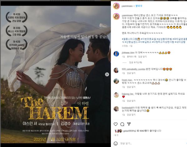 공개된 사진 속 THE HAREM이라는 영화포스터를 패러디하여 남편과의 훈훈한 투샷을 공개한 모습. 벨리댄서 야스민은 "오빠를 좋아하는 가장 큰 이유는 너무너무 재밌고 귀여워서(외모와는 다르게) 입니다. 아침부터 잠들기전까지 웃겨줘요" 라며 소식을 전했다.