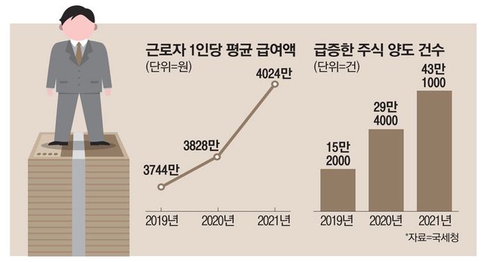 직장인들의 지난해 평균연봉이 4000만원을 넘어섰다. 억대 연봉 근로자도 처음으로 100만명을 돌파한 것으로 나타났다. 미국 등 증시 호황에 따른 서학개미 열풍으로 주식양도 건수는 50% 가까이 급증했다.