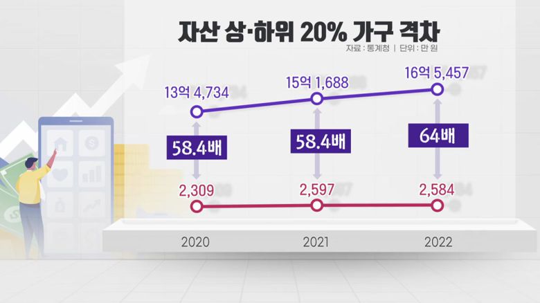 통계청이 해마다 발표하는 자료가 있는데 이게 가계금융복지 조사 자료예요. 2022년도 자료가 나왔는데 저는 이 자료 보고 눈에 가장 띄는 숫자가 64배였거든요. 그러니까 이게 뭐냐 하면 보유 자산 규모가 상위 20%, 하위 20% 이 가구 간의 자산 규모 차이가 64배 벌어졌다는 결과입니다. 이거 어떤 의미를 담고 있습니까?