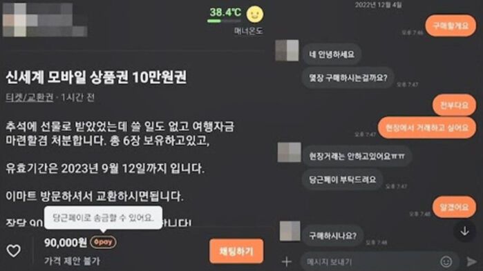 하지만 돈을 보내자 게시글은 삭제됐고, 판매자는 상품권을 보내주지 않고 돈만 받은 뒤 연락이 끊겼습니다.