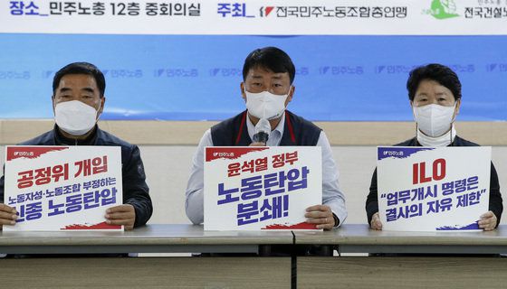 양경수 민노총 위원장은 “현재 화물연대 파업을 해소하는 유일한 길은 정부가 대화에 나서는 것”이라며 “민노총과 화물연대에 대한 공격을 중단하고 대화에 나서라”고 촉구했다. 또 “민노총이 정치 파업을 하는 게 아니라 정부가 파업을 정치적으로 악용하는 것”이라며 “대통령이 직접 교섭에 나오시라”고 제안했다.
