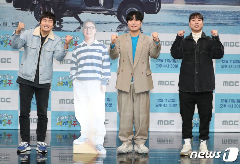 웹툰 작가 기안84(왼쪽부터)와 배우 이시언, 김지우 감독이 9일 오후 서울 마포구 상암 MBC에서 열린 MBC 예능프로그램 '태어난 김에 세계일주'(이하 태계 일주) 제작발표회에서 포즈를 취하고 있다. '태계일주'는 가방 하나 달랑 메고 무작정 남미로 떠난 기안84와 그를 위해 지구 반대편으로 달려온 찐형 이시언, 여행 유튜버 빠니보틀의 현지 밀착 여행기를 담았다. 2022.12.9/뉴스1 ⓒ News1 권현진 기자 |