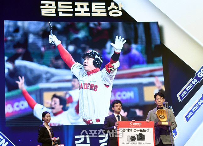 9일 서울 강남구 코엑스 오디토리움에서 열린 2022 KBO 골든글러브 시상식에서 골든포토상 수상자인 SSG 김강민을 대신해 맹수환 홍보팀장이 허상욱 한국스포츠사진기자회 사무국장으로부터 트로피를 건네받고 기념촬영을 하고 있다. 골든포토상을 수상한 김강민의 사진은 한국시리즈 5차전 9회말 역대 최초 대타 역전 끝내기 홈런을 친 순간을 담았다. 2022. 12. 9.