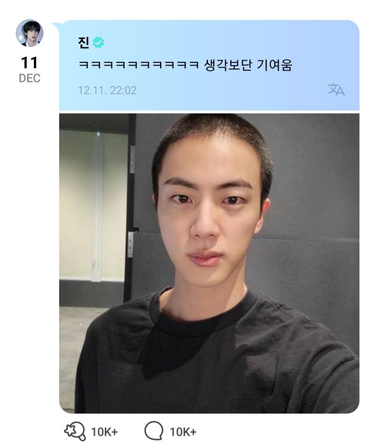 진은 11일 팬 소통 커뮤니티 위버스에 머리카락을 짧게 깎은 자신의 사진을 올렸다. 그러면서 “ㅋㅋㅋㅋ 생각보다 기여움(귀여움)”이라는 머리를 깎은 소감도 짧게 게재했다.
