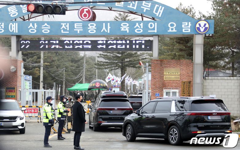 방탄소년단(BTS) 멤버 '진'이 탄 차량이 13일 경기도 연천군 육군 5사단 신병교육대로 들어가고 있다. 2022.12.13/뉴스1 ⓒ News1 권현진 기자 |