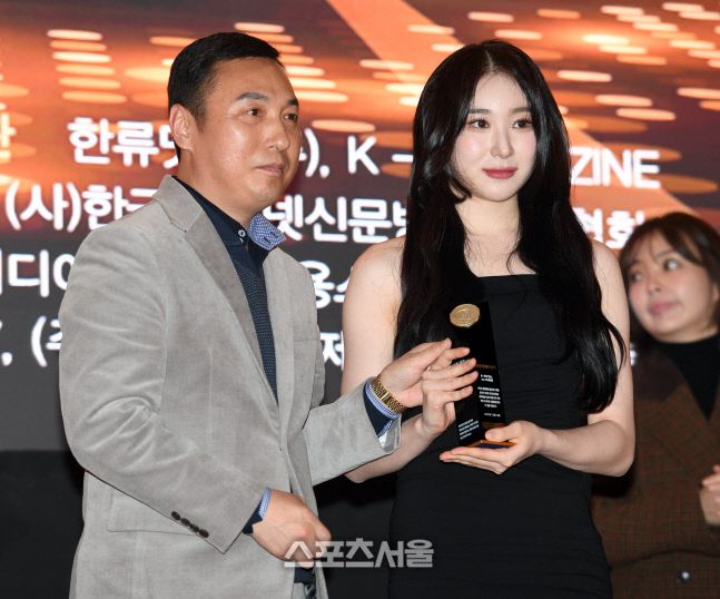 [스포츠서울 글.사진 | 이주상기자] 14일 서울 강남구 엘리에나 호텔에서 열린 ‘2022 대한민국 한류문화대상 시상식’에서 대중가요부문 대상을 수상한 가수 이채연이 기쁜 표정을 짓고 있다. 왼쪽은 이효진 조직위원장, ‘2022 대한민국 한류문화대상 시상식’은 방송.연예는 물론 정치, 경제, 사회 부문에서 한해 동안 한류 문화 발전에 두드러진 역할을 한 인물에게 주어지는 상이다. 조직위원장인 이효진 한류닷컴 대표는 “한류 문화를 찾는 전 세계인이 해마다 늘고 있다. 한류 문화가 관광 상품이 되는 현재, 국가 이미지 상승을 노력하겠다”라며 각오를 전했다. rainbow@sportsseoul.com