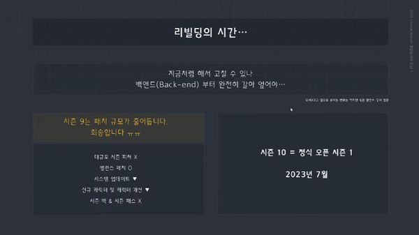이 회사는 내년 7월 시즌10을 통한 정식 서비스를 목표로 하고 있다. 그러나 정식 출시를 위한 최적화와 리빌딩 작업으로 인해 이후 이어질 시즌9에서는 변화가 적은 시기를 보내게 될 것이라고 양해의 뜻을 전했다.