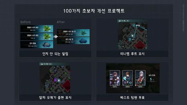 이 가운데 포커스 그룹 테스트(FGT)를 통해 유저들이 다양한 지점에서 장벽을 느끼고 게임에 적응하지 못하는 문제도 파악했다고 개발진은 밝혔다. 이를 통해 내부적으로 파악한 개선점이 많았고, '100가지 초보자 개선 프로젝트'를 진행하겠다고 밝혔다.