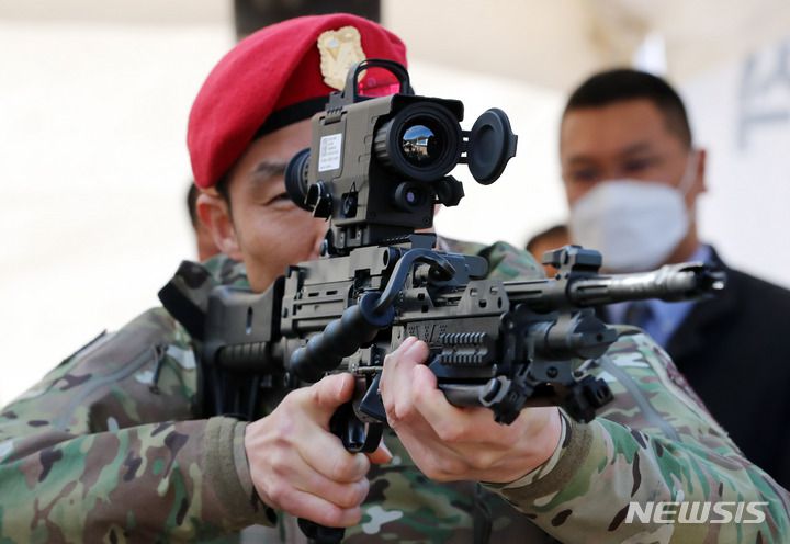 [부산=뉴시스] 하경민 기자 = 노후화된 K3기관총을 약 30년 만에 대체할 신형 K15기관총(5.56㎜)의 첫 출하식이 열린 16일 오전 부산 기장군 SNT모티브 공장에서 군 관계자가 신형 총기를 살펴보고 있다. K15기관총은 무게 7.3㎏, 길이 990~1070㎜, 발사속도 분당 700~1000발, 유효사거리 800m이다. 특히 주·야간 조준장치가 통합됐으며 총열을 신속 교환할 수 있고, 다양한 부수기재들을 활용할 수 있게 피카티니 레일이 장착됐다. 2022.12.16. yulnetphoto@newsis.com