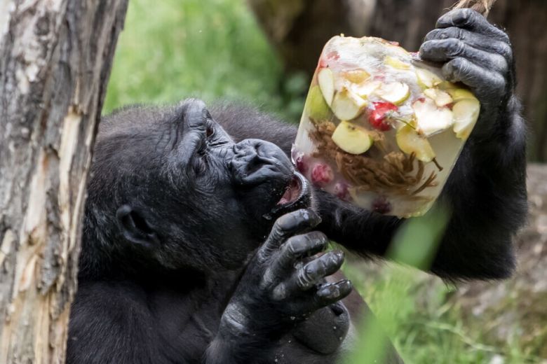 때 이른 더위가 찾아온 2019년 6월 체코의 한 동물원에서 고릴라가 얼음 과일을 먹고 있다. EPA 연합뉴스