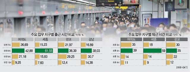 퇴근 시간도 이 같은 특성이 반영되는 것으로 나타났다. 판교는 오후 7~8시 퇴근 비율이 총 34%로 가장 높았다. 개발자가 많은 업무지구 특성상 야근이 가장 많은 곳으로 풀이된다. 반면 여의도는 전국에서 오후 5시 퇴근 비율(35%)이 가장 높은 업무지구다. 세종은 오후 6시 퇴근 비중이 가장 높은 59%로 나타났다.