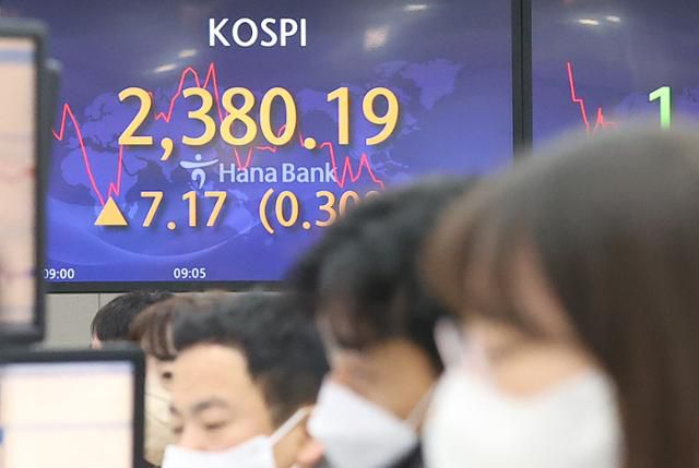 코스피가 전 거래일보다 12.03포인트(0.51%) 오른 2,385.05로 시작한 13일 서울 중구 하나은행 본점 딜링룸에서 딜러들이 업무를 보고 있다. 연합뉴스